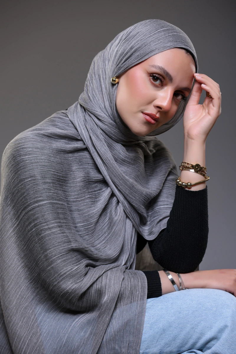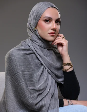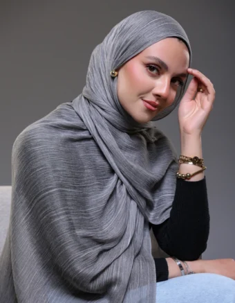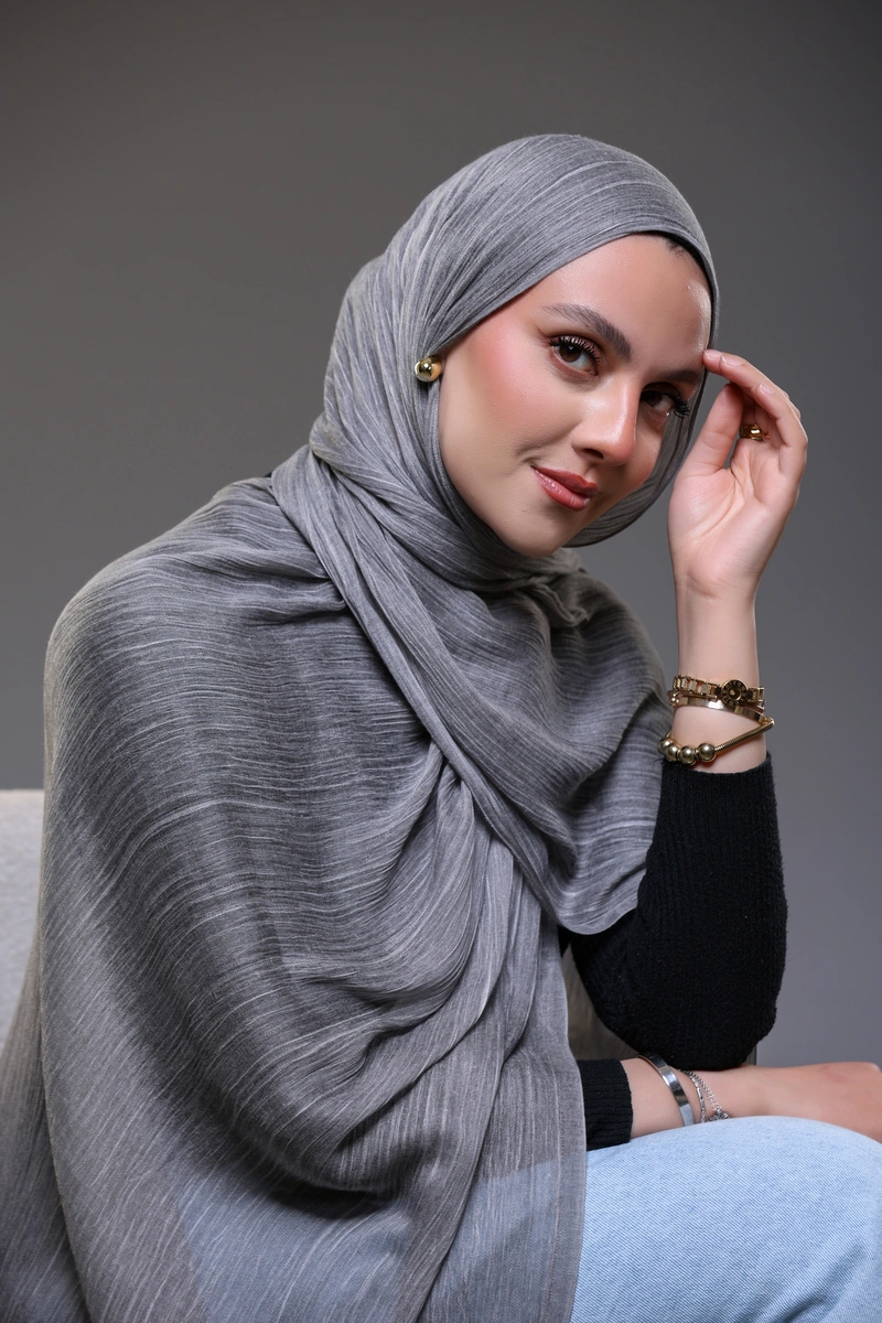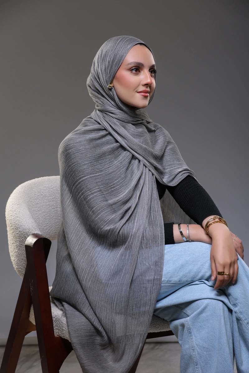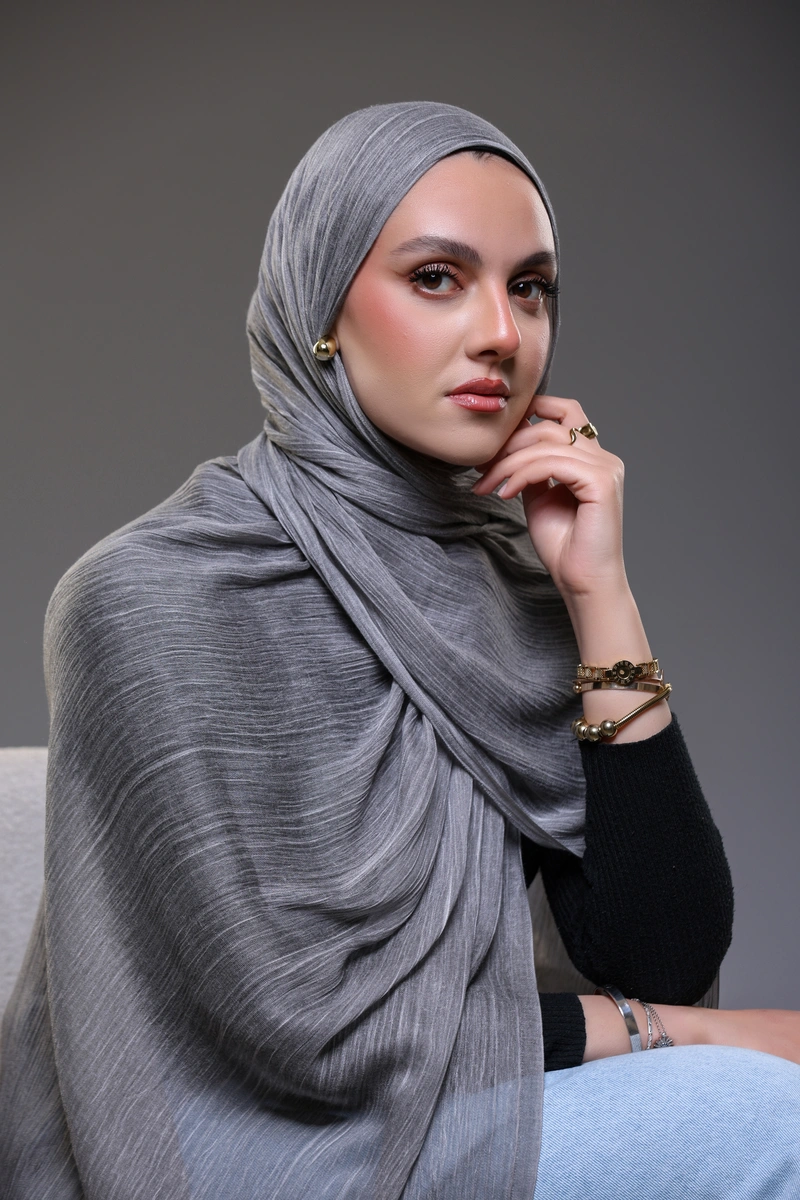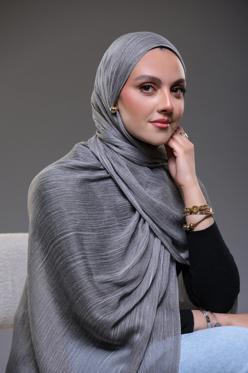 Discover timeless elegance with our Ruffled Hijab in Charcoal Grey .